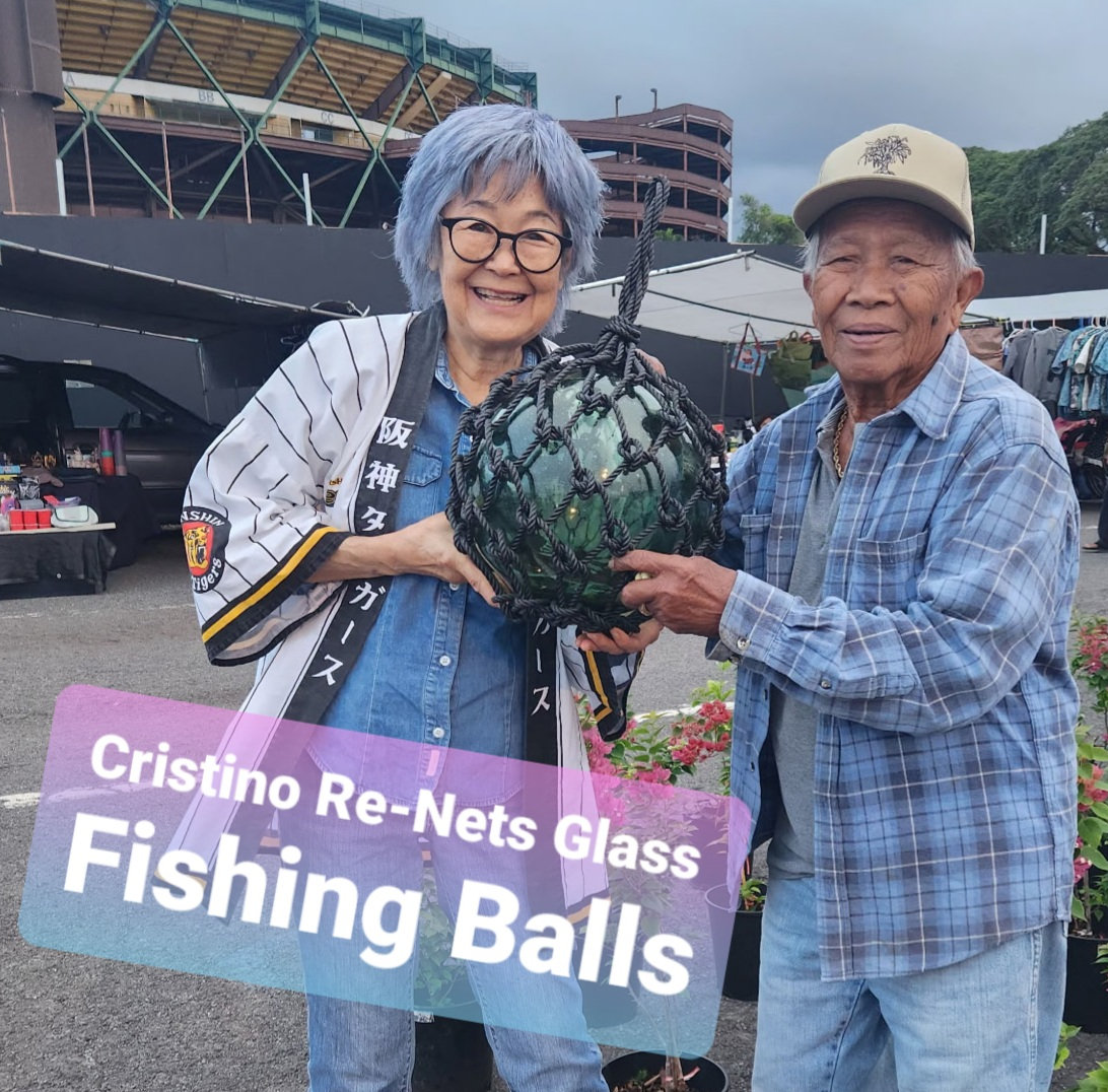 February 20: My formerly naked, vintage Japanese glass fishing float, was beautifully re-netted by Cristino! Topped with a loop handle for hanging or toting, it was expertly crafted in high quality rope that will last for generations. You may see him about your naked float at Sunday's Aloha Stadium Swapmeet in corner spot row B near the restrooms. Mahalo Cristino!